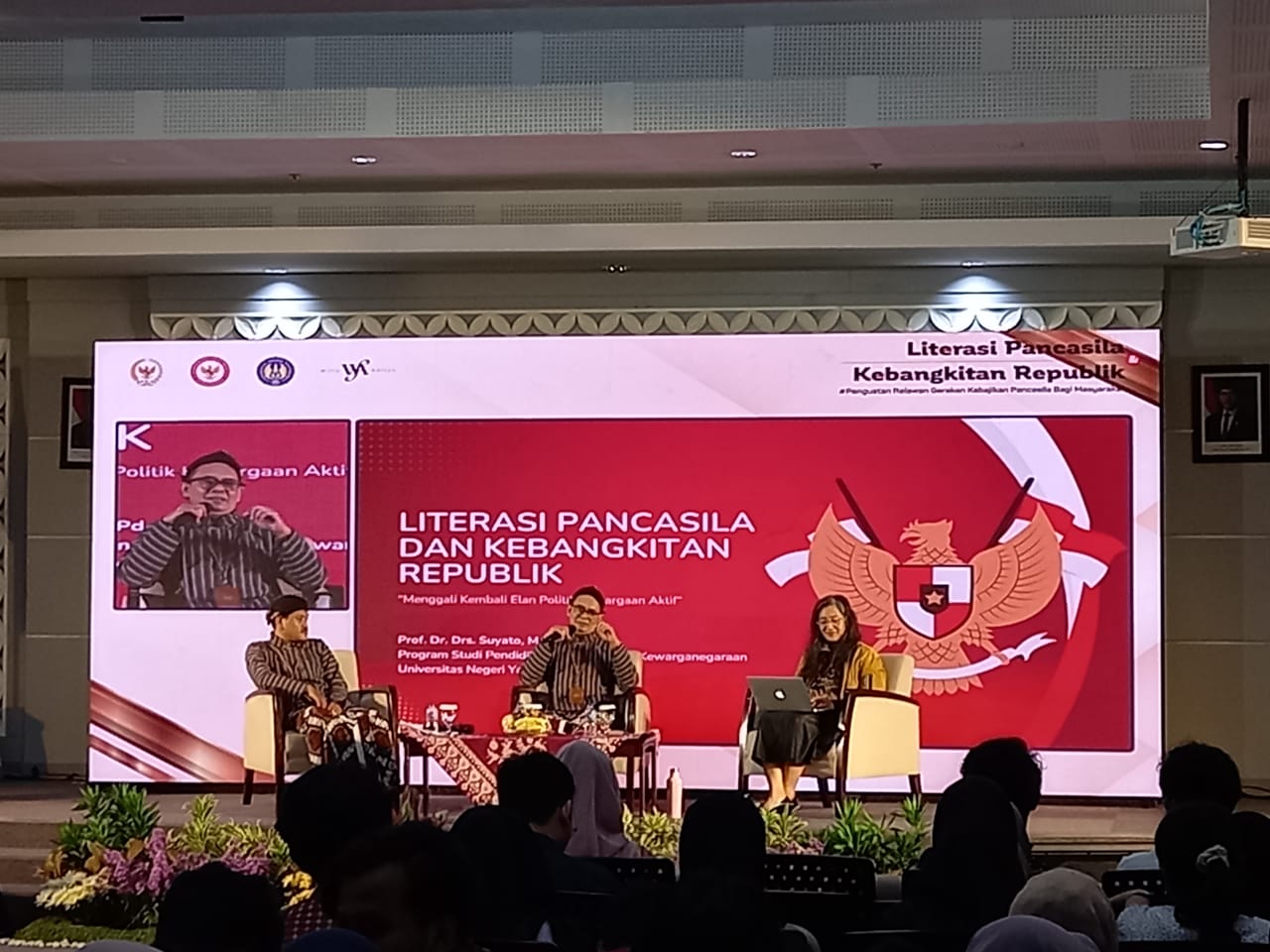 Seminar ini dimoderatori oleh Erlangga Hikmah Budhiyatma, Dosen Ilmu Politik Universitas Negeri Yogyakarta (UNY), yang memandu jalannya diskusi dengan cermat dan dinamis. Pemaparan utama disampaikan oleh Prof. Dr. Suyato, M.Pd., Guru Besar sekaligus Dosen Pendidikan Kewarganegaraan, yang menyoroti pentingnya literasi Pancasila sebagai pondasi karakter bangsa serta instrumen kebangkitan republik dalam menghadapi tantangan ideologis dan moral generasi muda dan Dr. Irene Camelyn Sinaga, AP., M.Pd. sebagai Direktur pengkajian implementasi BPIP.