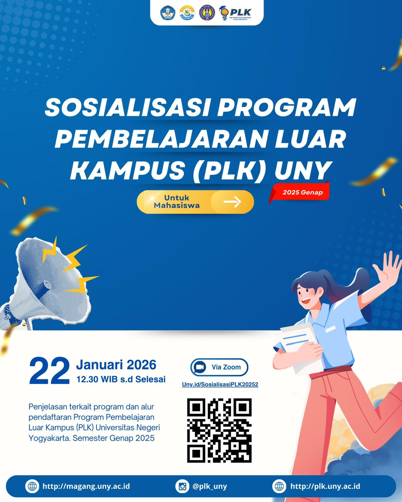 Universitas Negeri Yogyakarta (UNY) akan menyelenggarakan kegiatan Sosialisasi Program Pembelajaran Luar Kampus (PLK) sebagai bagian dari upaya penguatan implementasi kebijakan pembelajaran inovatif dan kolaboratif di lingkungan perguruan tinggi. Kegiatan sosialisasi ini bertujuan untuk memberikan pemahaman komprehensif kepada mahasiswa dan sivitas akademika mengenai konsep, mekanisme, serta manfaat Program PLK dalam mendukung pengembangan kompetensi akademik dan profesional mahasiswa.